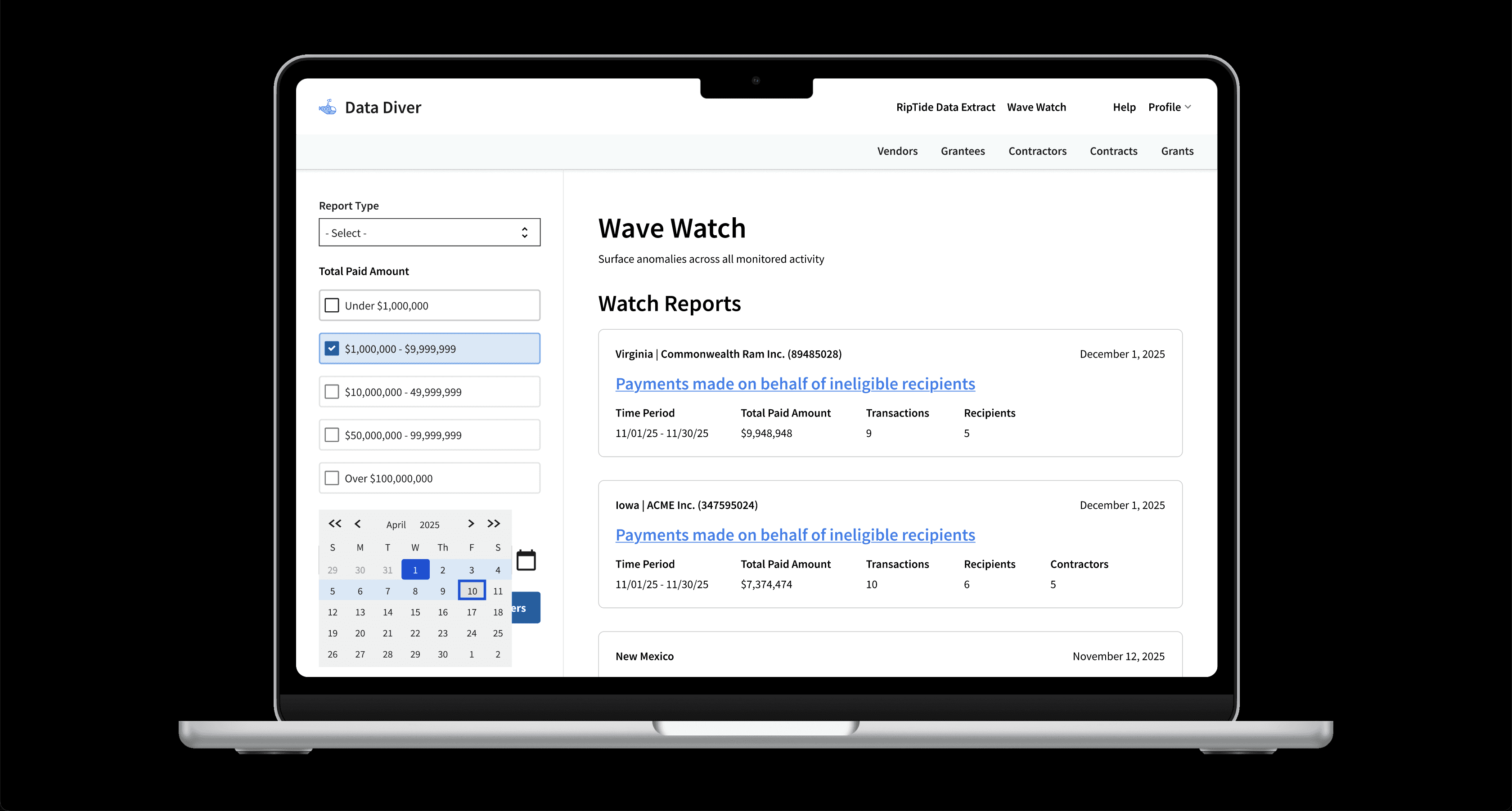 Mostly the auditors never researched the individual contractor as our product team assumed. Rather the auditors researched individual states and the money they gave to any contractor in that state.
